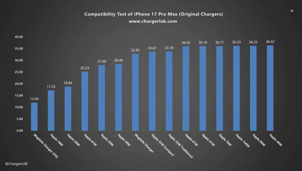 وب‌سایت ChargerLAB در بررسی‌های خود شارژ آیفون 17 پرو مکس را با طیفی از شارژرهای اپل، از 18 وات تا 140 وات، آزمایش کرده است. نتایج نشان داد این دستگاه می‌تواند به حداکثر سرعت شارژ USB-C تا حدود 36 وات دست یابد؛ یعنی افزایشی حدود 20 درصد نسبت به رکورد 30 وات در آیفون 16 پرو.